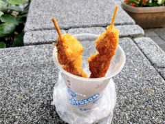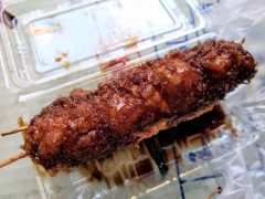いもフライ(80円)の衣はカリカリ。芋はほくほくでソースはほんのり甘めの甘辛です。