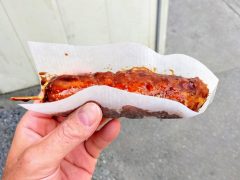 いもフライとは蒸したジャガイモを串刺しにて揚げたお料理。味付けには特製のソースがかかっています。もちろん揚げたてがベストだと思いますが、時間がたつとソースが染み込んでしっとりさが増す。一味違った趣が楽しめます。私がお店の方に聞いた話だと、佐野市は特にジャガイモが名産というわけではないけど昔から食べられているそう。まさに佐野市のソウルフードですね。
